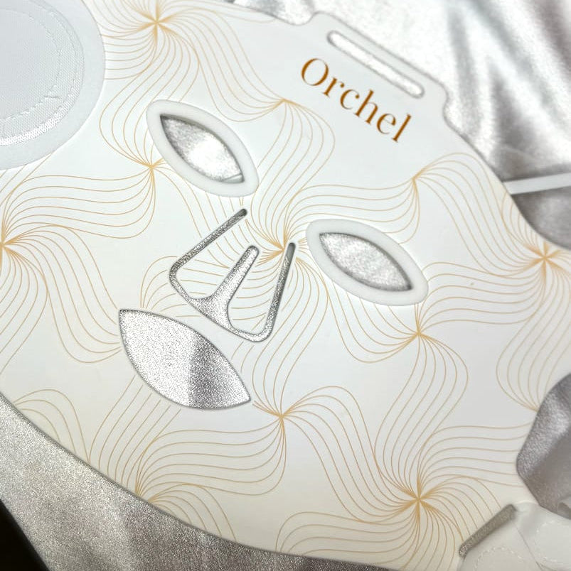 The Orchel Lumière LED Mask delivers optimized light energy (photobiomodulation) through four targeted wavelengths to signal skin cells and improve tone, texture, and radiance—non-invasive, UV-free, in 10-minute sessions.